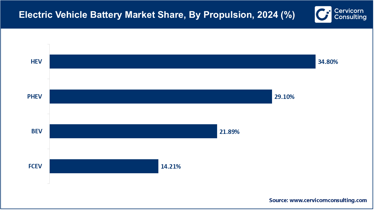 Battery Electric Vehicle (BEV): Battery Electric Vehicle (BEV) segment has registered 21.89% of market share in 2024. BEVs are fully electric vehicles powered solely by batteries. The increasing focus on reducing greenhouse gas emissions and advancements in battery technology are driving the demand for BEVs. Government incentives and growing charging infrastructure are further supporting their adoption, making BEVs a key segment in the EV battery market.